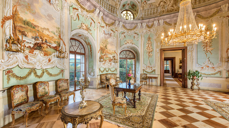 Architektonicky čistá zámecká budova ukrývá bohatě zařízené interiéry ve stylu baroko, rokoko, empír a biedermeier. Jsou vybaveny sbírkami porcelánu, orientálních předmětů i množstvím předmětů denní potřeby. Nejcennější sbírkou je ovšem rozsáhlá kolekce obrazů z 16.–19. století se vzácným souborem děl nizozemského malířství a pracemi významných českých autorů. Působivý autenticky dochovaný interiér zámecké kaple je dílem mistra moravského sochařství Ondřeje Schweigla, jehož sochy zdobí