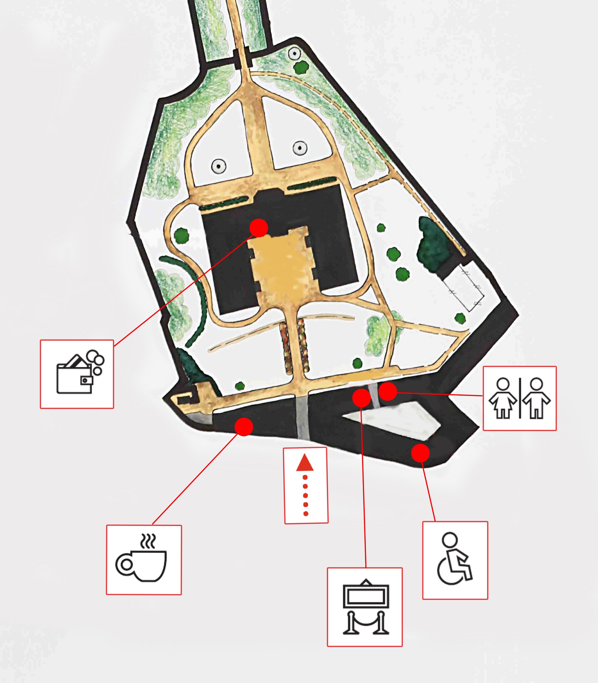 Vstup do areálu od hlavní cesty je v mírném sklonu. Přístup je zde komplikovaný díky povrchu z dlažebních kostek, který může v nepříznivém počasí klouzat.